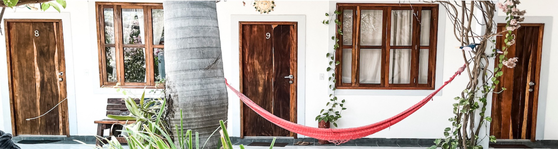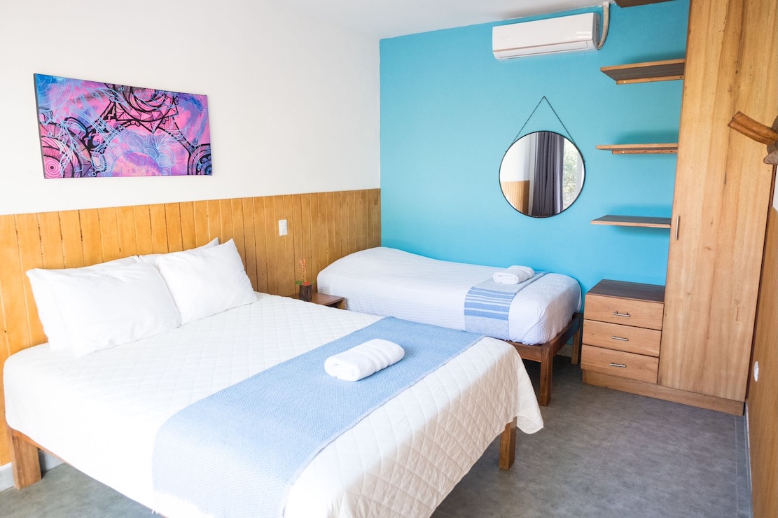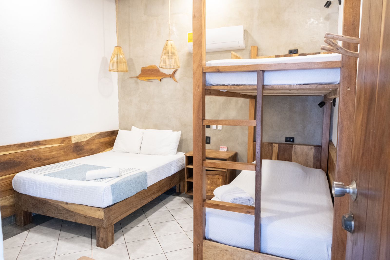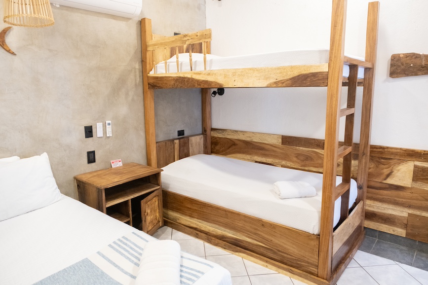 O Standard Room é um quarto muito confortável e privativo, com uma cama de casal padrão e uma beliche. O quarto está localizado no térreo, na parte de trás do hotel, atravessando a rua. Com vista para o jardim, possui um terraço externo tranquilo com redes. O quarto conta com cofre, ar-condicionado e cortinas blackout. Banheiro compartilhado, serviço de limpeza diário, toalhas e toalhas de piscina.